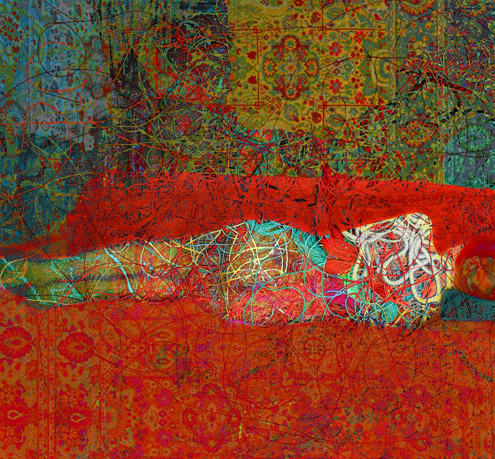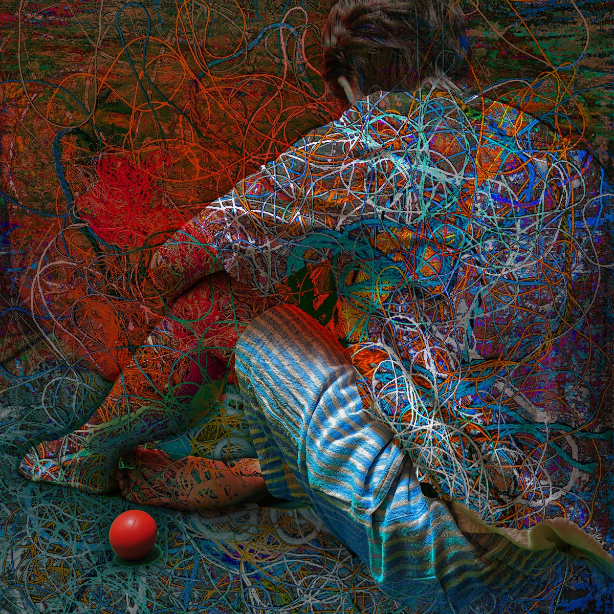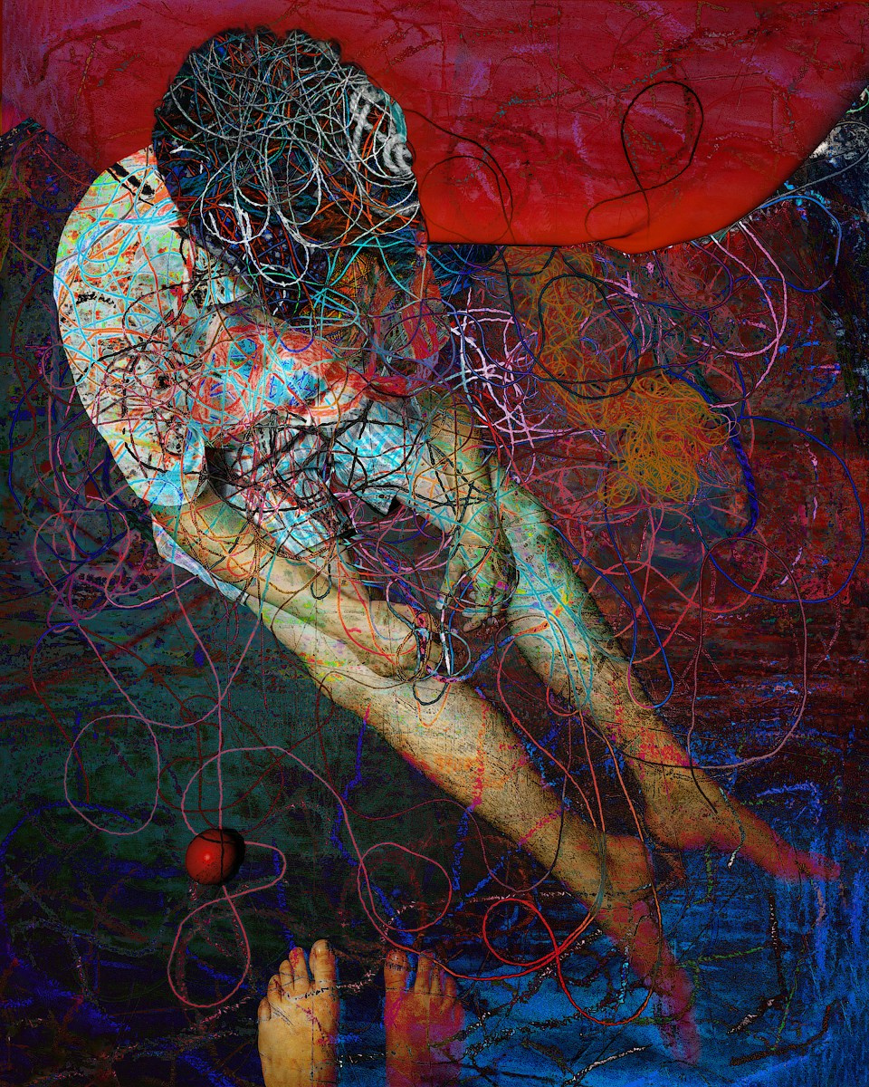 Отталкиваясь от идеальных фабричных мотков как символа абсолютного порядка, автор становится агентом хаоса, создавая из нитей спонтанные абстрактные коллажи. В процессе этого «распада» возникает новая, эмерджентная упорядоченность. Фотография выступает здесь не как документация, а как завершающий акт творения, запечатлевая рожденные хаосом композиции — как в чистой абстракции, так и в синтезе с фигуративными изображениями.